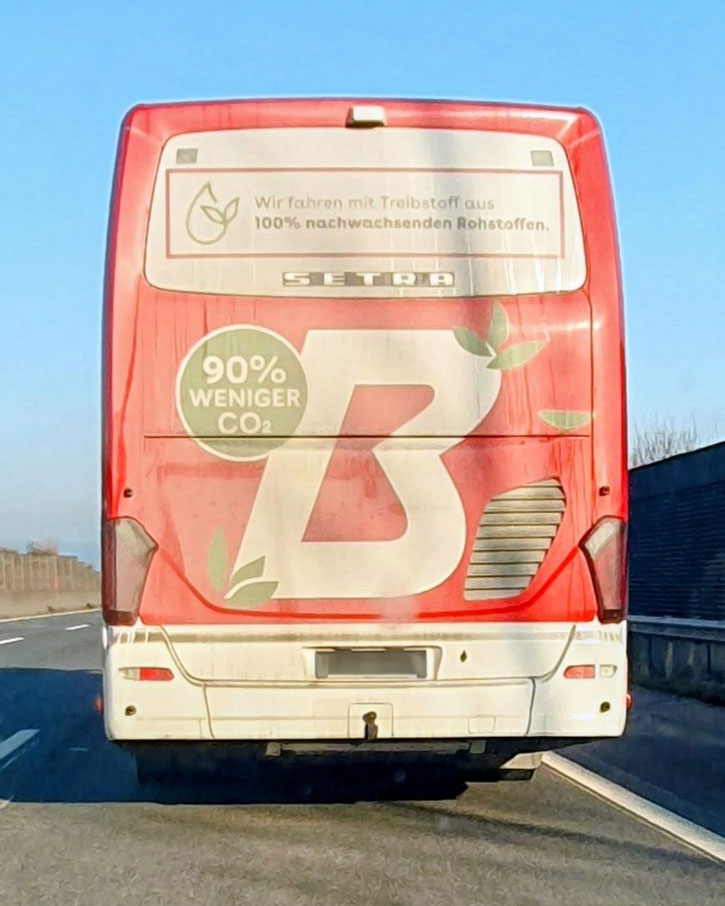 Insofern bestätigt sich der Verdacht, dass hier unsauber grün kommuniziert wird – weil für Verbraucher:innen unklar bleibt, ob sich der Werbeslogan nur auf den jeweils beklebten Bus bezieht oder auf das gesamte Unternehmen – das Blaguss-Firmenlogo prangt ja direkt neben dem Slogan. Eine Formulierung wie „Dieser Bus fährt mit Treibstoff …“ anstelle von „Wir fahren mit Treibstoff …“ wäre klarer gewesen.